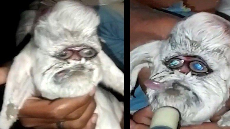 Bulu putih itu juga mengelilingi mulutnya dengan mata yang melotot. Matanya pun sejajar, dan terdapat lingkaran hitam bak manusia yang berkacamata.