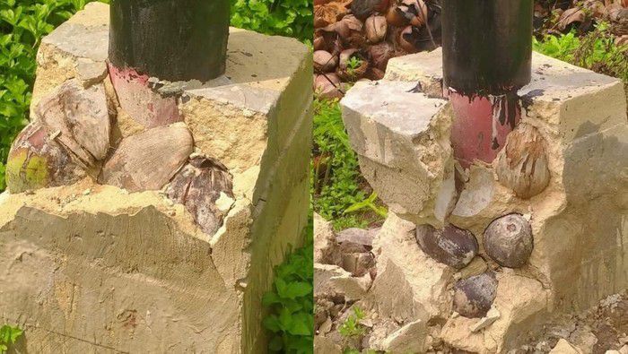 Di video itu, tampak bagian pondasi di tiang sudah terbelah, dan memperlihatkan adanya campuran adukan semen berserta kelapa yang sudah tua.