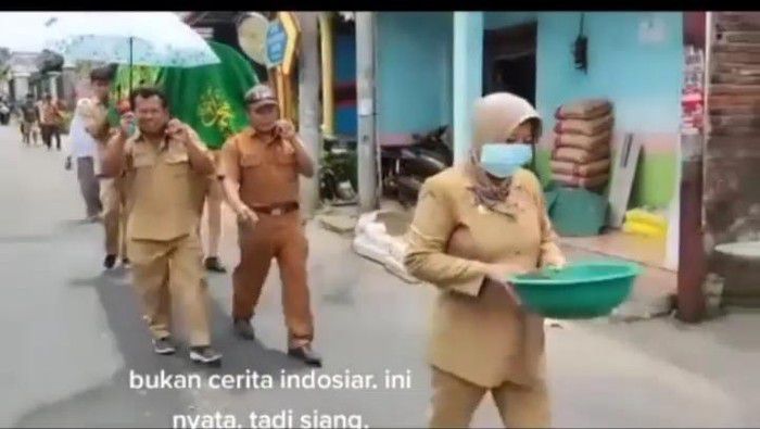 Anehnya keranda jenazah itu digotong justru bukan tetangga atau keluarganya melainkan para petugas yang diduga bekerja di kantor kelurahan atau kecamatan karena mengenakan seragam PNS. Dilansir dari Instagram @terangmedia, nampak ada empat orang pria berseragam PNS sedang menggotong keranda, di depan mereka ada seorang wanita yang menaburkan bunga sepanjang perjalanan menuju pemakaman.