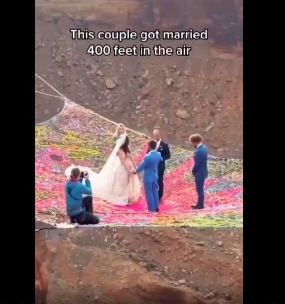 Di video tersebut, terlihat keduanya menikah di atas ketinggian sekitar 400 feet di atas udara. Ketinggian itu setara dengan 121 meter jika dikonversikan.