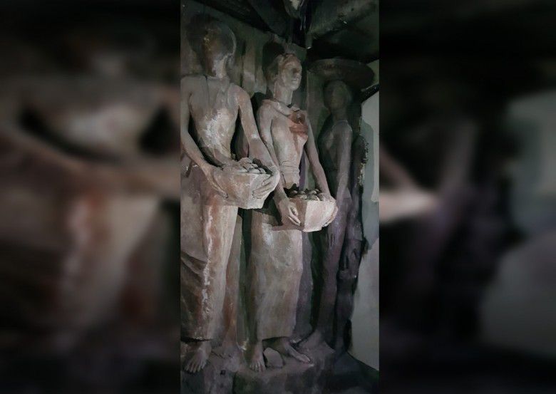 Kalau diamati sih, pada relief itu terdapat gambaran kehidupan masyarakat yang berprofesi sebagai petani dan nelayan. Tampak patung berwujud manusia itu sedang membawa hasil panen dan tangkapan sambil menggunakan caping khas orang pedesaan.