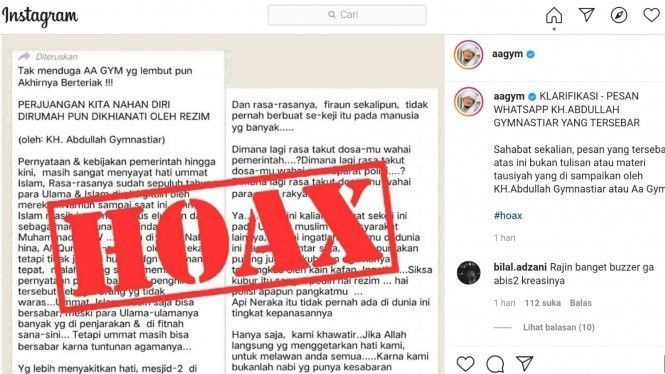 "Semoga tidak terjadi lagi informasi hoax yang mengatasnamakan orang lain, karena itu sangat merugikan serta dzolim." lanjut Aa Gym.