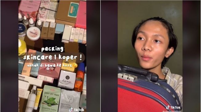 Viral seorang pria di TikTok yang membawa koleksi skincare satu koper ke kos barunya (via tiktok)