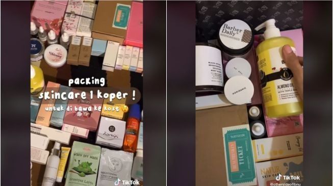 Viral seorang pria di TikTok yang membawa koleksi skincare satu koper ke kos barunya (via tiktok)