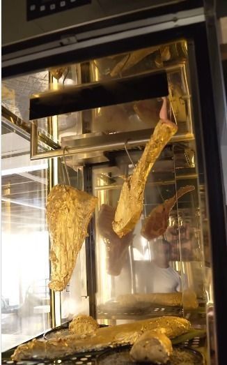 Untuk bagian paling atasnya dipakai untuk menggantung tomahawk steak dan potongan tulang sapi berbalut lapisan emas.