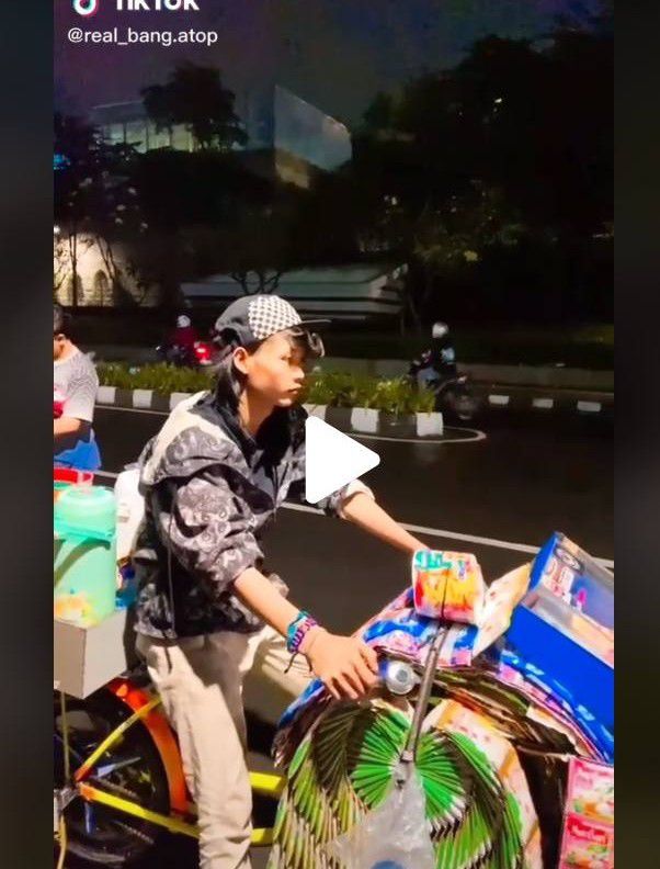 Video tersebut diunggah oleh akun TikTok bernama @real.bang.atop. Dari video tersebut, tampak Bonge mengenakan pakaian nyentriknya sambil menjual kopi di pinggir jalan dengan sepeda.