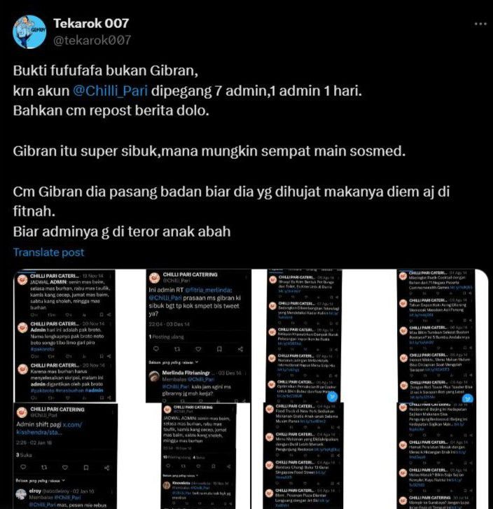 "Bukti fufufafa bukan Gibran, karena akun @Chilli_Pari dipegang 7 admin, 1 admin 1 hari. Bahkan cuma repost berita dulu. Gibran itu super sibuk, mana mungkin sempat main sosmed. Cuma Gibran dia pasang badan biar dia yang dihujat makanya diam aja difitnah. Biar adminnya nggak diteror Anak Abah," tulis @tekarok007.