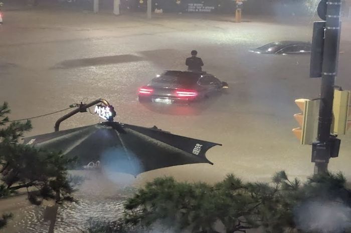 :quality(80):format(jpeg)/entries/2022-08/11/39243-2-4e6e16be58f502c9fe80fec7cd0c6cb4.jpg) Viral foto seorang pria yang duduk santai di atas kap mobil saat banjir di Korea Selatan (insertlive.com)