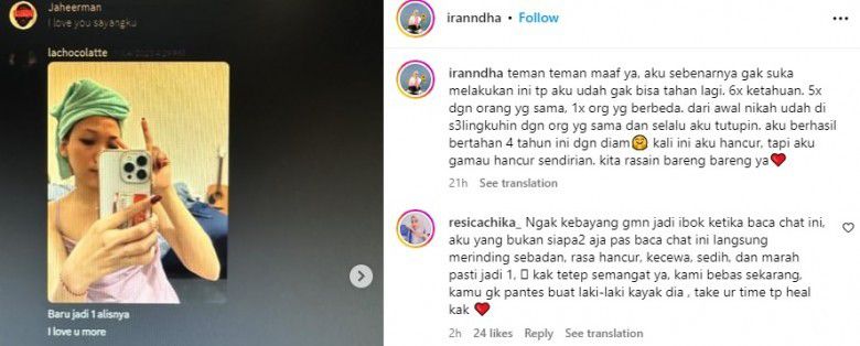 “Teman teman maaf ya, aku sebenarnya gak suka melakukan ini tp aku udah gak bisa tahan lagi. 6x ketahuan. 5x dgn orang yg sama, 1x org yg berbeda,” tulis Ira. Lanjutnya, dia mengatakan sejak awal menikah memang sang suami disebut suka selingkuh dengan beberapa wanita namun Ira sebagai istri menutupinya.
