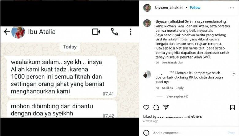 Dari unggahan Instagram pribadinya, Yazen al Hakimi memperlihatkan isi percakapannya dengan Atalia. Ia menjelaskan bahwa apa yang dialami oleh Ridwan Kamil hanyalah fitnah belaka.