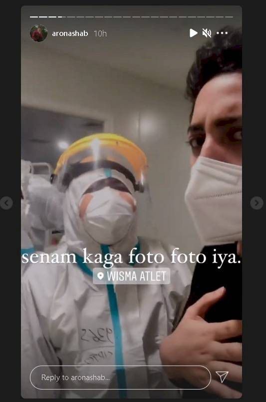 “Emang tahu ini siapa? sudah pakai masker kenapa masih tahu aje ye” ucap Aron Ashab mengungkap suasana di Wisma Atlet. Lalu Aron mengunggah story nya tersebut dengan caption “Senam kagak, foto-foto iya.”