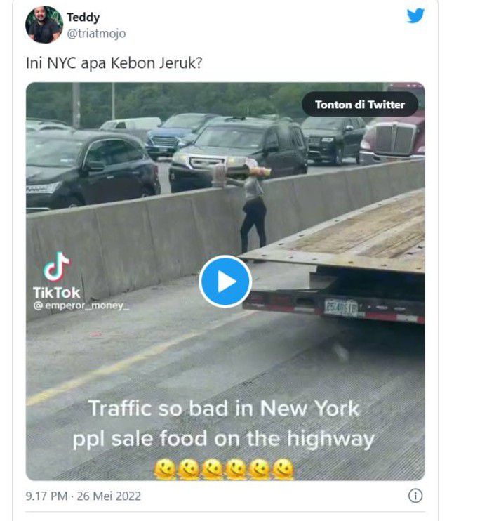 Video yang berdurasi 9 detik itu pun langsung membuat warganet heran. Sebab, beberapa orang yang berdagang di kemacetan New York itu benar-benar terlihat seperti di situasi jalanan Jakarta.