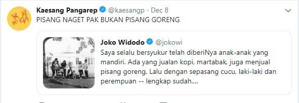 Tidak hanya itu saja yang menarik, rupanya Kaesang pada keterangan foto yang diunggah Jokowi itu. Dia mengoreksi bahwa ucapan sang ayah yang menyebut usahanya berjualan pisang goreng. "PISANG NAGET PAK BUKAN PISANG GORENG," tulis Kaesang di Twitter.