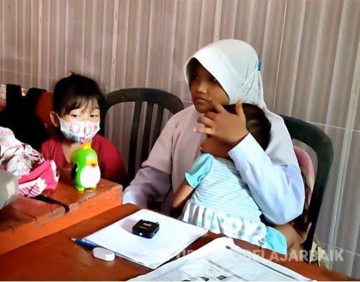 Selama belajar di sekolah, Rika harus duduk sambil menggendong adiknya yang bungsu. Sementara adiknya yang kira-kira berusia 4 tahun duduk di kursi sebelah Rika. Untungnya adik-adik Rika tidak rewel dan menangis saat diajak kakaknya selama beberapa jam di sekolah.
