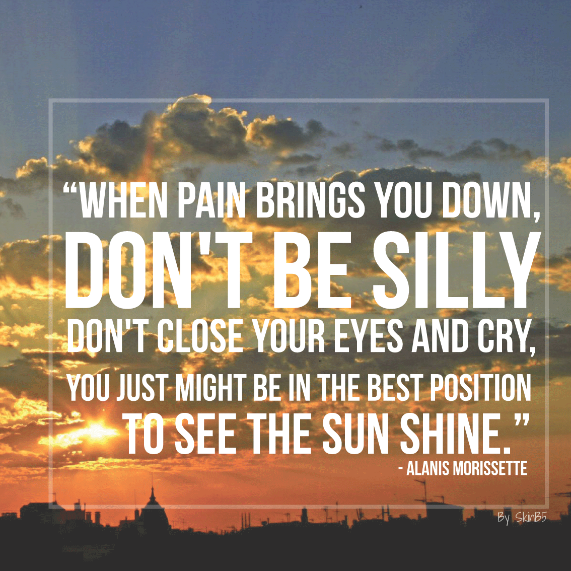 When pain brings you down, don't be silly, don't close your eyes and cry, you just might be in the best position to see the sun shine - Alanis Morissette