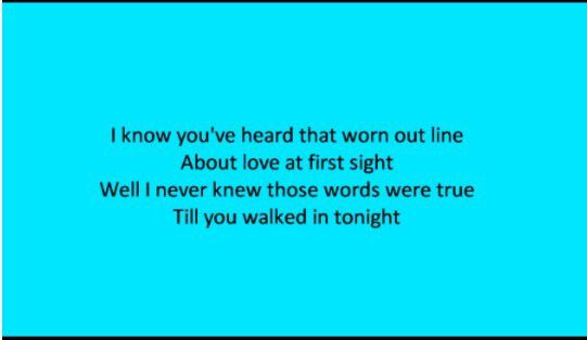 "I know you've heard that worn out line about love at first sight. Well, I never knew those words were true 'til you walked in tonight."