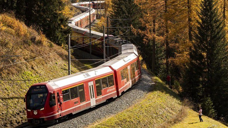Perusahaan Kereta Api Rhaetian menggunakan kereta super panjang mereka dalam perjalanan melalui rute Albula-Bernina dari Preda ke Bergün.