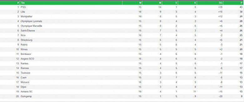 PSG berhasil menduduki posisi puncak klasmen Ligue 1 Prancis dengan perolehan 43 poin. Mbappe dkk unggul 14 angka dari peringkat kedua, yang mana peringkat kedua saat ini diduduki Montpellier.