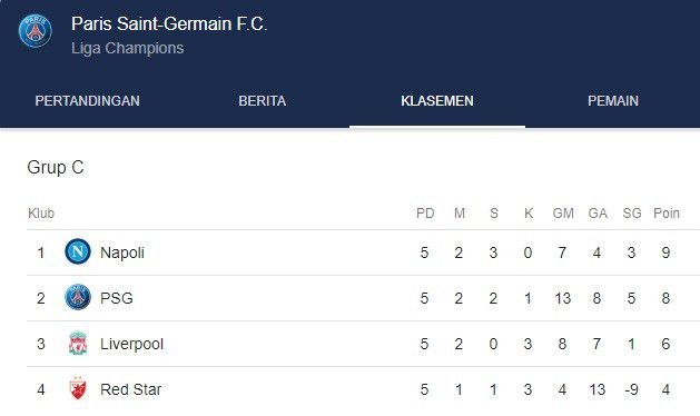 Klasemen Liga Champions PSG (screenshot google.co.id)