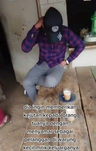 Dilansir dari Instagram @myprofesi, pria itu mengenakan kemeja lengan panjang, memakai topi, dan tentunya mengenakan masker. Kebetulan orangtuanya membuka warung kecil-kecilan di rumah yang menjual makanan ringan dan kopi.