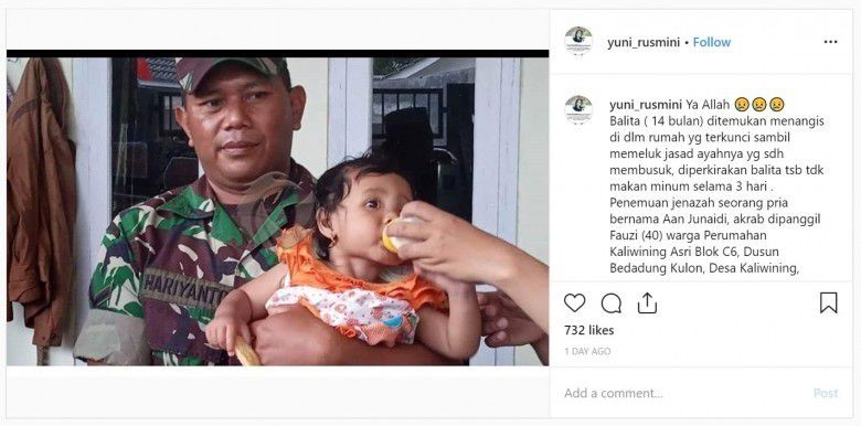 N terlihat menangis dan lemas sembari tangan kecilnya memeluk jenazah Fauzi yang sudah membusuk. Warga memperkirakan jika Fauzi meninggal sudah sejak 3 hari yang lalu. Sehingga bisa diprediksikan bahwa N juga tidak mengkonsumsi apapun sejak itu.