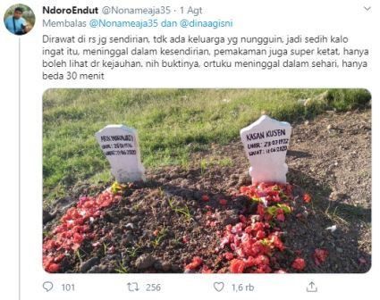 “Dirawat di RS juga sendirian, tidak ada keluarga yang nungguin, jadi sedih kalo ingat itu, meninggal dalam kesendirian, pemakaman juga super ketat, hanya boleh lihat dr kejauhan. Nih buktinya, ortuku meninggal dalam sehari, hanya beda 30 menit,” katanya.