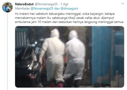“Ini malam hari sebelum keluargaku meninggal, coba bayangin, betapa mencekamnya malam itu, sekeluarga tiba-tiba sesak nafas akut, dijemput ambulance jam 10 malam dan keesokan harinya langsung meninggal semua,” ujarnya.