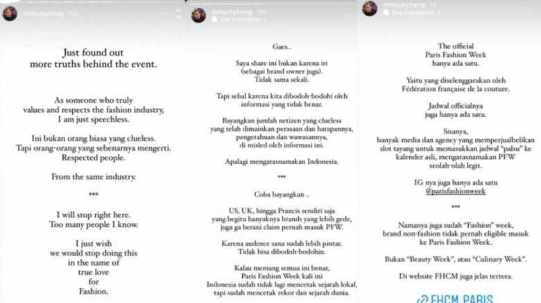 Lebih lanjut, Lucky juga menilai brand lokal tersebut telah melakukan pembodohan publik dengan mengklaim tampil di Paris Fashion Week. Sejumlah netizen kemudian menyadari kalau brand-brand tersebut tidak berani menandai akun resmi Paris Fashion Week 2022 dalam unggahan yang mereka bagikan selama di Paris.