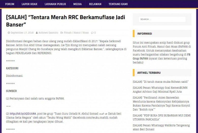 Berdasarkan hasil penelusuran, diketahui bahwa isu tentara merah RRC berkamuflase menjadi Banser dan Ansor sudah terklarifikasi pada artikel periksa fakta berjudul [SALAH] “Tentara Merah RRC Berkamuflase Jadi Banser” yang tayang di turnbackhoax.id pada 17 September 2018.
