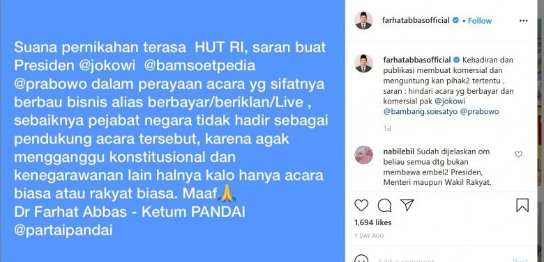 Postingan Farhat Abbas tentang Jokowi kondangan (Instagram/farhatabbasofficial)