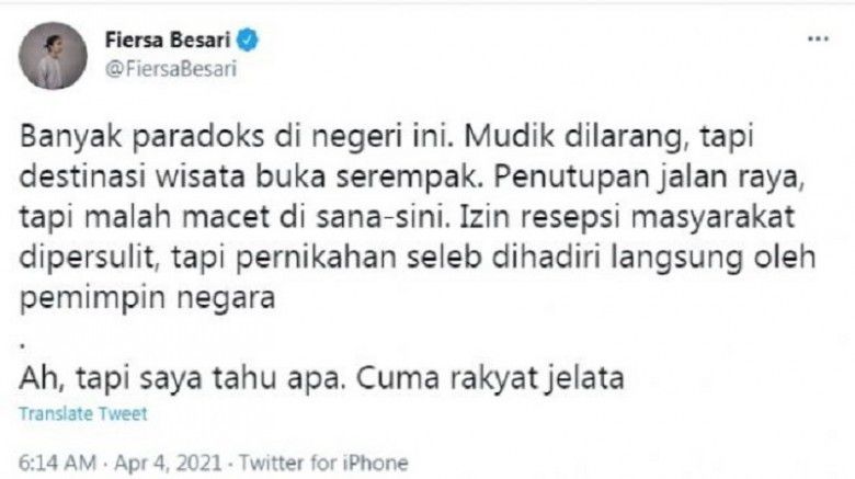 "Banyak paradoks di negeri ini. Izin resepsi masyarakat dipersulit, tapi pernikahan seleb dihadiri langsung pemimpin negara," tulisnya.