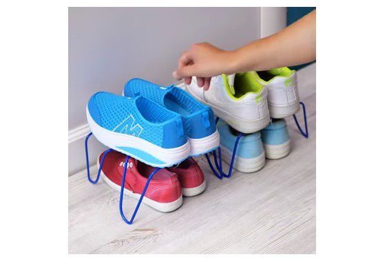 Beli rak sepatu kayu atau besi mahal? Tapi kamu butuh rak nih biar sepatu gak berantakan. Yap, kamu bisa bikin sendiri dari gantungan baju. Bikin aja kayak digambar ya gengs. Tinggal bengkokkan empat gantungan baju. Satukan jadi sepasang pakai selotip. Udah deh jadi.