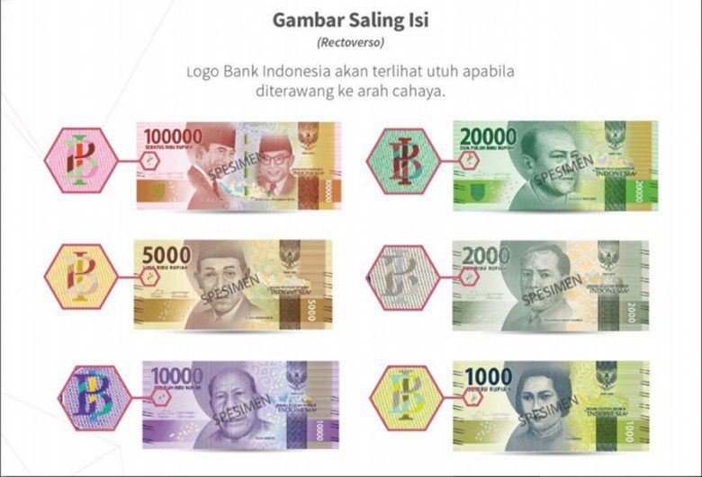 Bagian belakang ada gambar tersembunyi berupa angka 100, 50, 20, 10 yang terlihat di sudut pandang tertentu pada pecahan Rp 100.000, Rp 50.000, Rp 20.000, dan Rp 10.000.