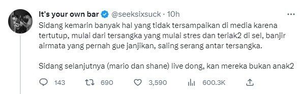 “Sidang kemarin banyak hal yang tidak tersampaikan di media karena tertutupbanjir airmata yang pernah gue janjikan,” cuit Jonathan. Bahkan dalam sidang lalu para tersangka diduga saling menyerang satu sama lain. “Saling serang antar tersangka,” katanya.