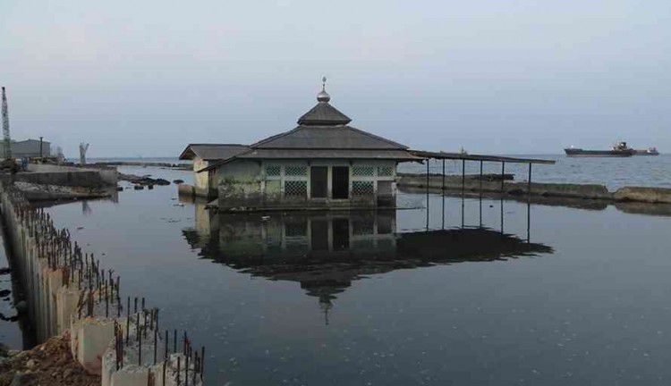 Setengah bagian masjid sudah terendam air laut. Bagian sekitarnya mirip dengan kota mati. Terendam air laut karena pengaruh abrasi dan penurunan ketinggian tanah.