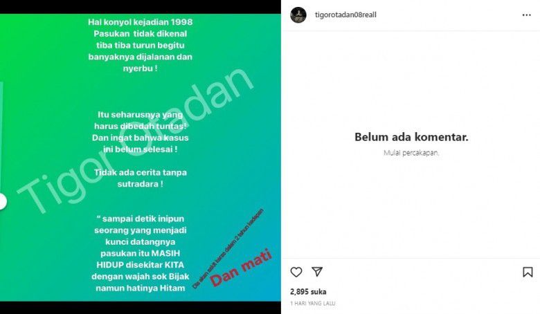 "Hal konyol kejadian 1998 pasukan tidak dikenal tiba-tiba turun begitu banyaknya di jalanan dan nyerbu! Itu seharusnya yang harus dibedah tuntas! Dan ingat bahwa kasus ini belum tuntas," kata Tigor di akun Instagramnya @tigorotadan08real.