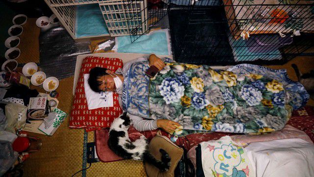 Sakae Kato berbaring di tempat tidurnya bersama kucing yang ia selamatkan lima tahun lalu (reuters.com)