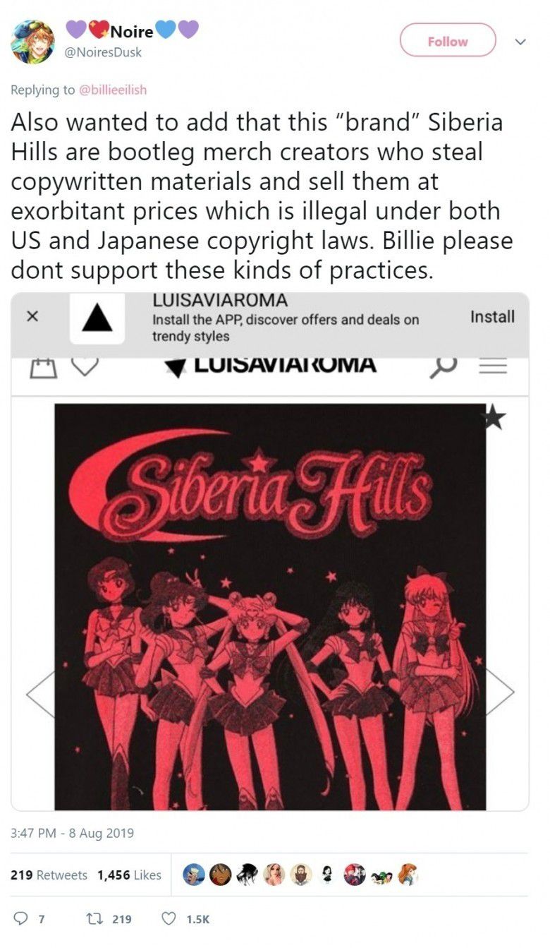 "'Merek' Siberia Hills ini adalah pembuat barang rampasan barang rampasan yang mencuri materi copywritten dan menjualnya dengan harga selangit yang ilegal menurut undang-undang hak cipta AS dan Jepang," tulis pengguna Twitter @NoiresDusk.