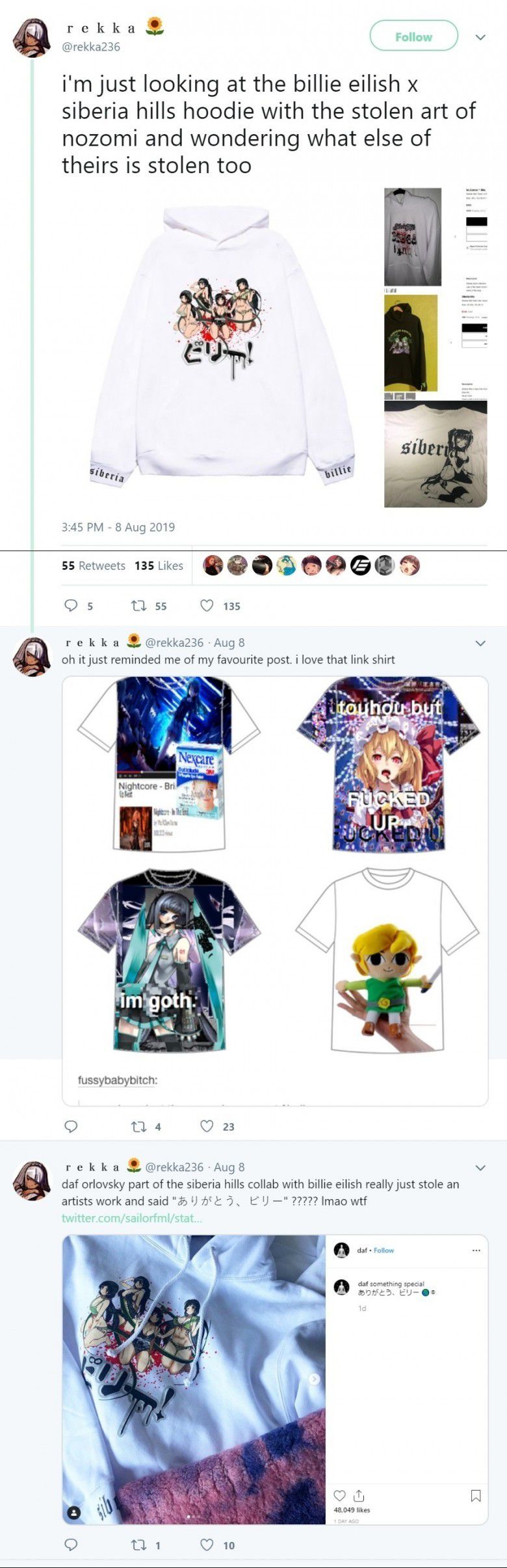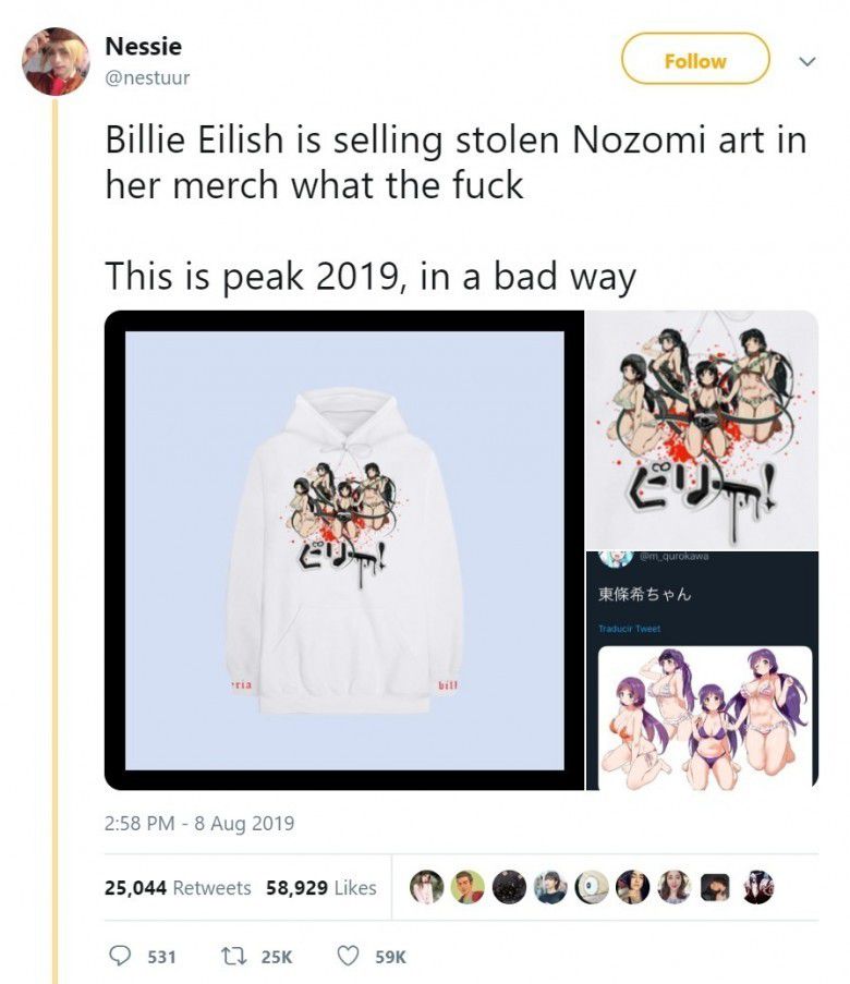 “Billie Eilish menjual karya seni Nozomi yang dicuri di merchandise-nya. Ini puncak 2019, dengan cara yang buruk,” tulis @nestuur dalam tweet yang sejak itu mengumpulkan ribuan retweet.