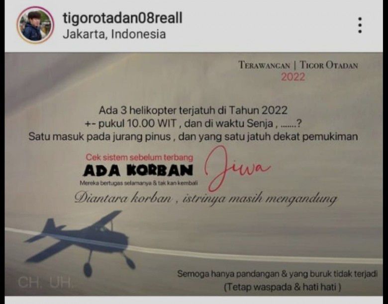 Tigor Otadan juga sempat mengunggah berita tentang pesawat jatuh di Blora yang seakan menunjukkan kalau ramalannya kembali terbukti. Namun entah karena alasan apa, tidak lama setelah mengunggahnya Tigor menghapus postingannya tersebut.