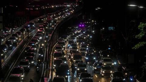 Suasana Kendaraan Terjebak Macet di Jalan Tol Cawang-Grogol, Jakarta, Sabtu 1 Mei 2021 (ANTARA FOTO)
