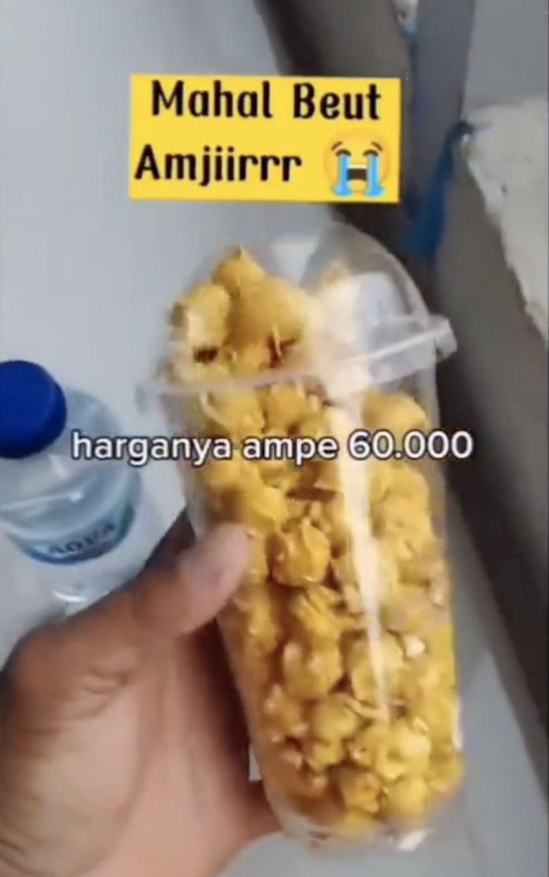 "Ya allah guys, popcorn segini doang, sama Aqua yang kecil banget begini dah 330ml. Nih popcorn harganya Rp 60 ribu," ujarnya di video.
