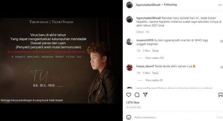 Tigor Otadan mengatakan kalau dia sudah pernah meramal tentang penyakit hepatitis sejak 2021 lalu. Namun kali ini, dia mengisyaratkan kalau virus yang muncul berbeda dengan yang hepatitis yang memiliki gejala awal muntah dan diare.