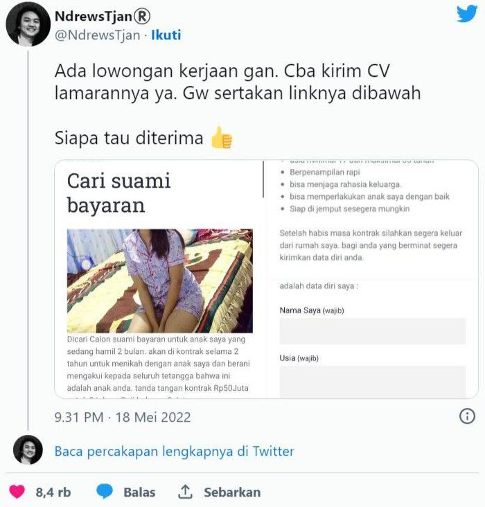 "Ada lowongan kerjaan gan. Cba kirim CV lamarannya ya. Gw sertakan linknya dibawah Siapa tau diterima," tulis akun NdrewsTjan dengan menyertakan tautan lowongan suami bayaran.