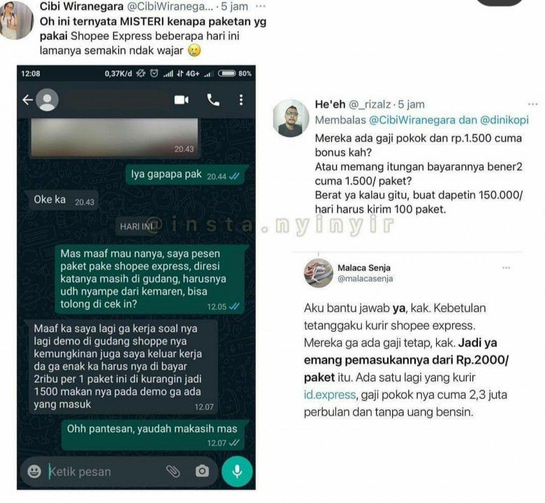 Ditelusuri lebih lanjut, pengguna Twitter dengan akun @CibiWiranegara yang menjadi awal permulaan ramainya pembahasan soal kurir Shopee Express. Akun tersebut mengungkap pembicaraan WhatsApp dengan seorang kurir Shopee Express yang mengatakan telah terjadi demo pegawai akibat upah menurun dari Rp 2.000 menjadi Rp 1.500. Postingan itu pun diunggah ulang oleh akun Twitter @lalaaphonee dan nggak kalah viral.