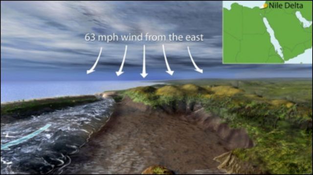 Drews akhirnya menyimpulkan bahwa angin kencang 63mph dari timur di atas danau yang direkonstruksi secara digital di sepanjang Mediterania dekat Port Said hari ini dapat menyapu air kembali ke pantai barat yang memperlihatkan dataran lumpur yang luas dan menciptakan jembatan darat yang akan tetap tinggi dan kering selama empat jam. .