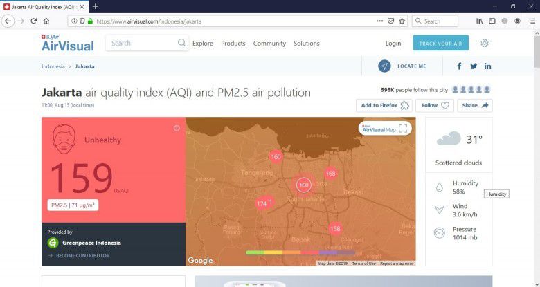 Laman ini setiap jam memantau polusi di udara Jakarta menggunakan aplikasi. Nilai yang ditujukan untuk Ibukota Indonesia ini tak pernah menyentuh di bawah 100 selama satu minggu ini. Bahkan pada 15 Agustus menunjukan AQI sebesar 165 dengan konsentrasi parameter 2.5 mencapai 81,9 ug/m3.