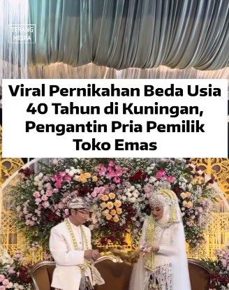 Seorang pria pemilik toko emas di Kabupaten Kuningan, Jawa Barat menikah lagi dengan wanita muda. Beda usia keduanya sekitar 40 tahun. Meski terpaut jarak cukup jauh, pasangan itu akhirnya menikah dengan menggelar resepsi pernikahan.