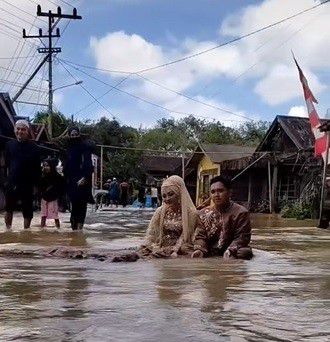 Sepasang pengantin di sebuah tempat tetap berbahagia. Padahal di hari tersebut lokasi resepsi pernikahan digenangi banjir setinggi sekitar 30 centimeter. Hal itu tidak menunda mereka lakukan resepsi. Mereka pun rela basah-basahan saat berjalan menuju ke pelaminan.