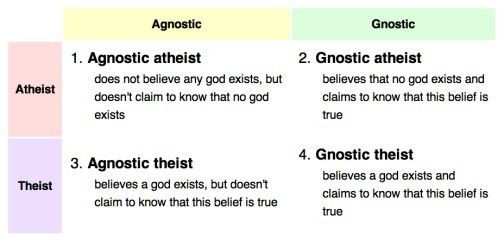 Sedangkan atheis lebih mengacu kepada tindakan dari pandangan yang dilontarkan oleh agnostisisme. Bahkan atheis sendiri terbagi dua, yaitu atheis gnostik dan atheis agnostik. Atheis gnostik adalah kepercayaan yang tidak percaya dengan adanya Tuhan namun mampu membuktikan pandangan tersebut. Sedangkan atheis agnostik adalah golongan orang yang tidak percaya akan adanya Tuhan namun tak dapat membuktikannya.
